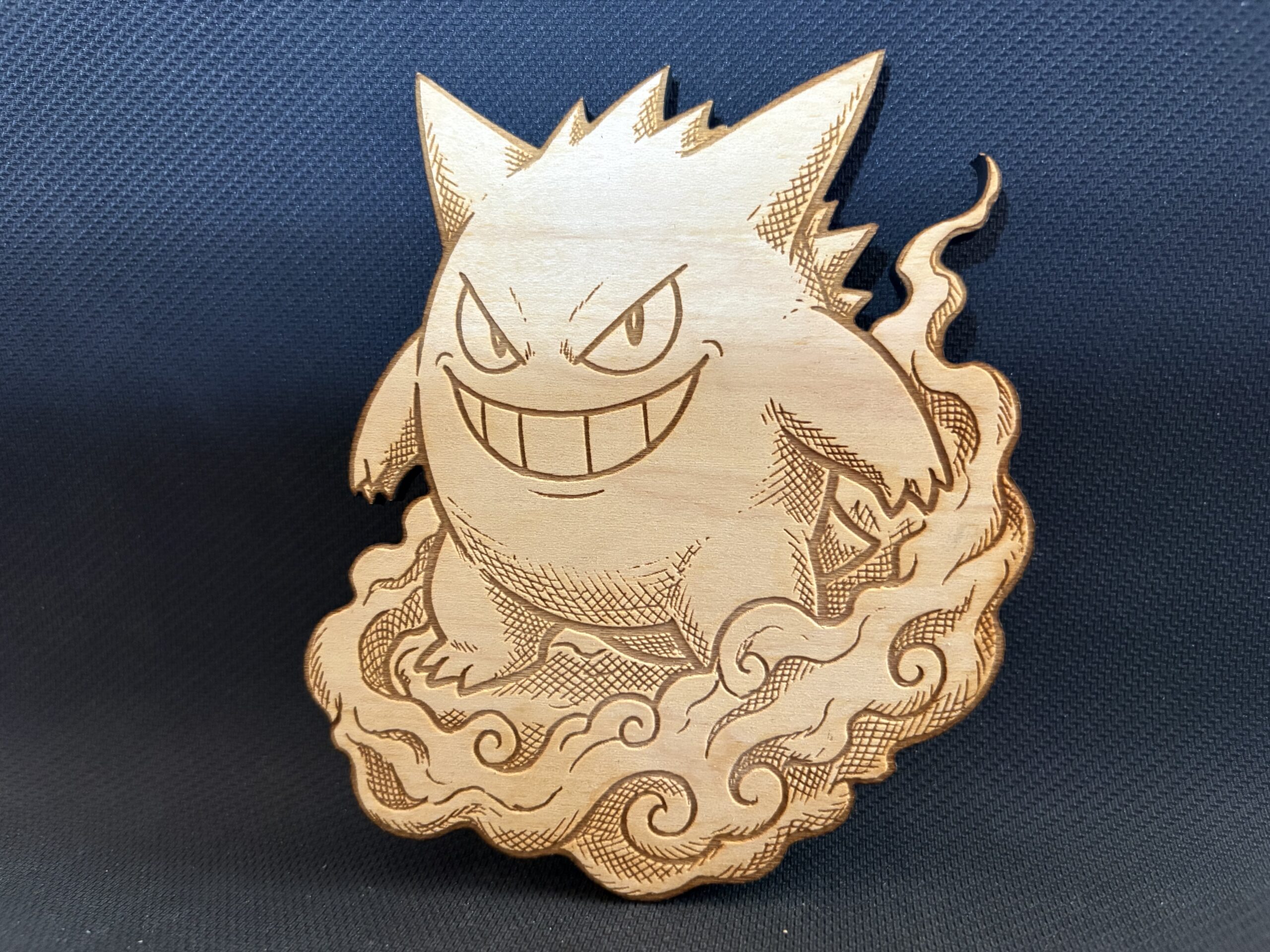 Welcome the Shadows into Your Game Room Add a touch of spooky mischief to your walls with this carefully crafted wooden art piece. Designed for fans of retro monster-catching games and nocturnal creatures, this handmade decor celebrates the playful yet eerie spirit of a classic grinning phantom. Lurking in the dark, it’s the perfect tribute to the ultimate spooky companion.